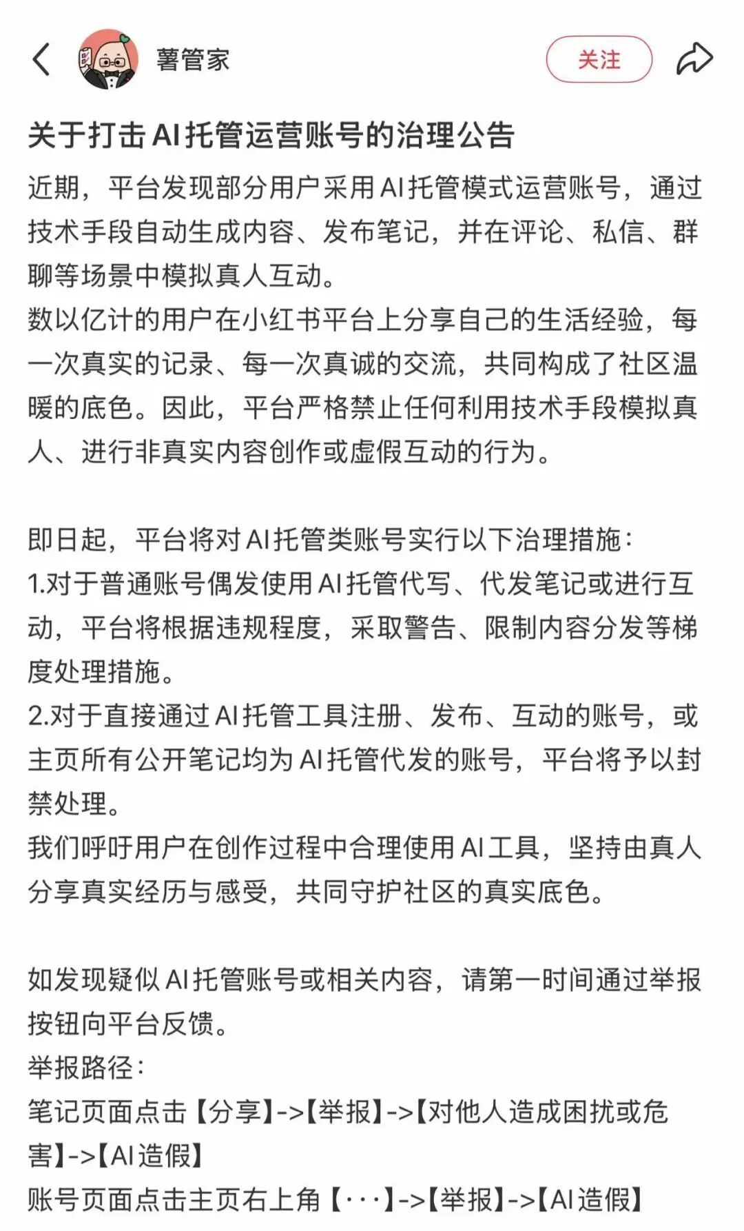 即日起,平台将对AI托管类账号实行以下治理措施: